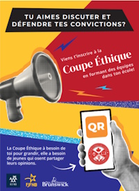 Plongez au cœur d’une compétition stimulante où la réflexion, le débat constructif et l’esprit d’équipe sont à l’honneur. La Coupe éthique provinciale rassemble des équipes d’écoles secondaires francophones de partout au Nouveau-Brunswick pour analyser, discuter et défendre des positions sur des enjeux éthiques réels qui touchent notre société.